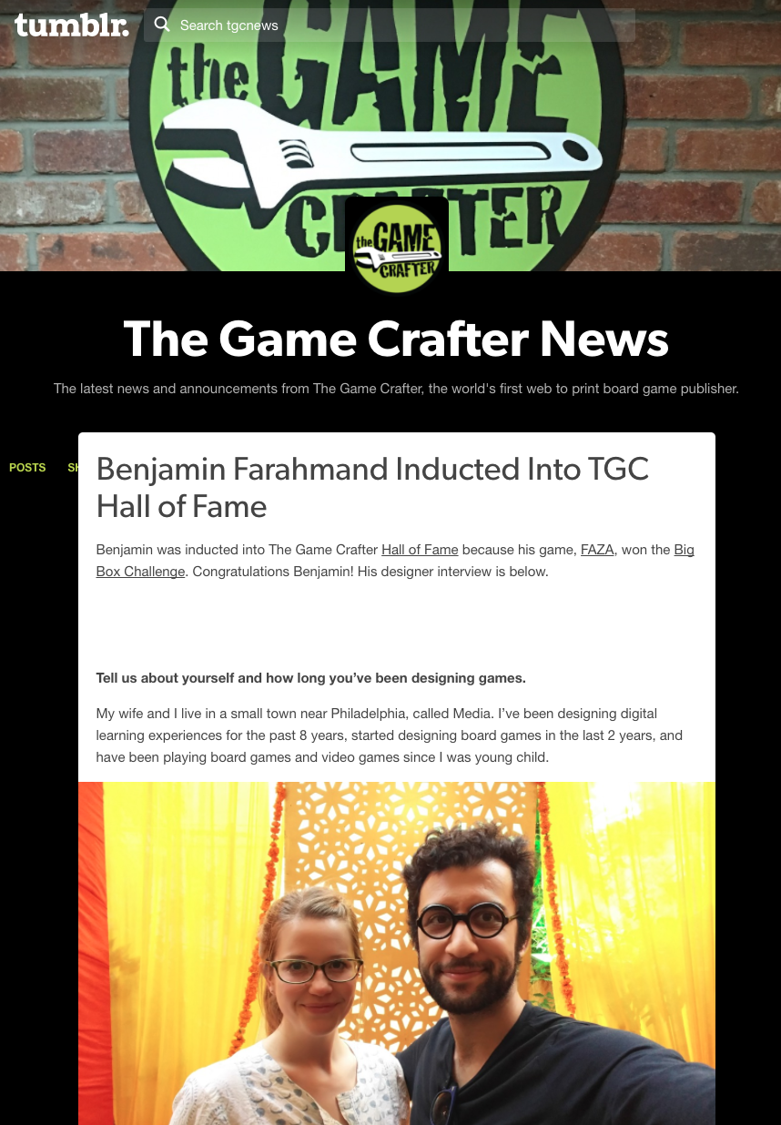 Some really cool news I’d like to share with you all. I was inducted into The Game Crafter’s Hall of Fame because a few months ago FAZA won the Big Box Challenge. While there’s still a ton of work left to do for FAZA, I’m feeling excited to reach this milestone and also honored to have the game design work I’ve been doing be recognized by the game community.